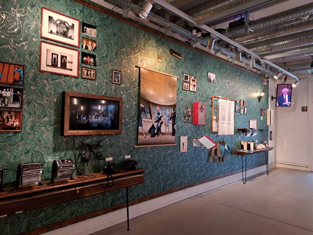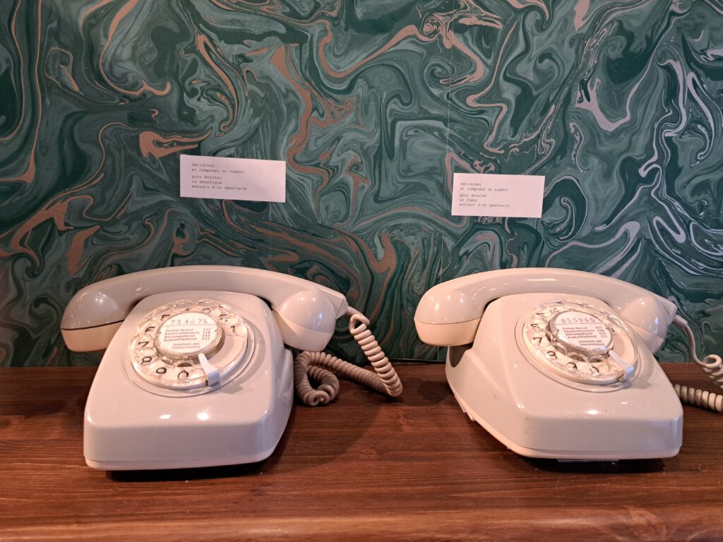 Dès notre arrivée au théâtre au bord du lac, on entre dans une salle de plain-pied dont on voit, au premier coup d’œil, qu’elle est totalement dédiée à l’accueil des publics, à créer des liens avec les spectateur·ices & entre les spectateur·ices. Dans cet espace où se trouvent billetterie, accueil et bar/restauration, on distingue immédiatement des coins, des recoins, des murs habillés, décorés d’éléments des spectacles passés et à venir : entre musée vivant et appartement de famille, des décors étrangement familiers où l’on se sent de suite à l’aise !